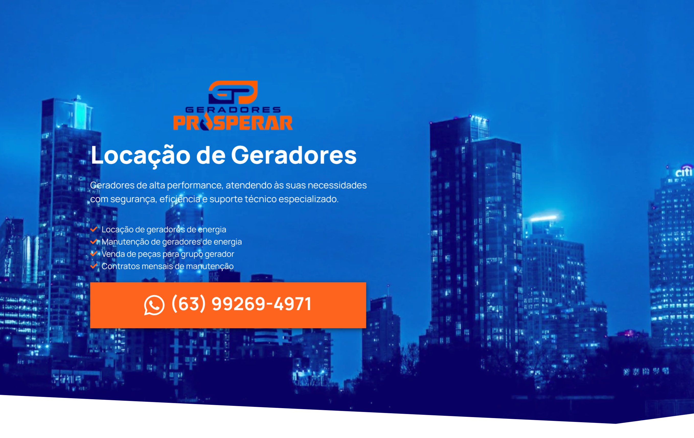 Site institucional completo para empresa de locação de geradores, com catálogo de produtos e sistema de solicitação de orçamentos.