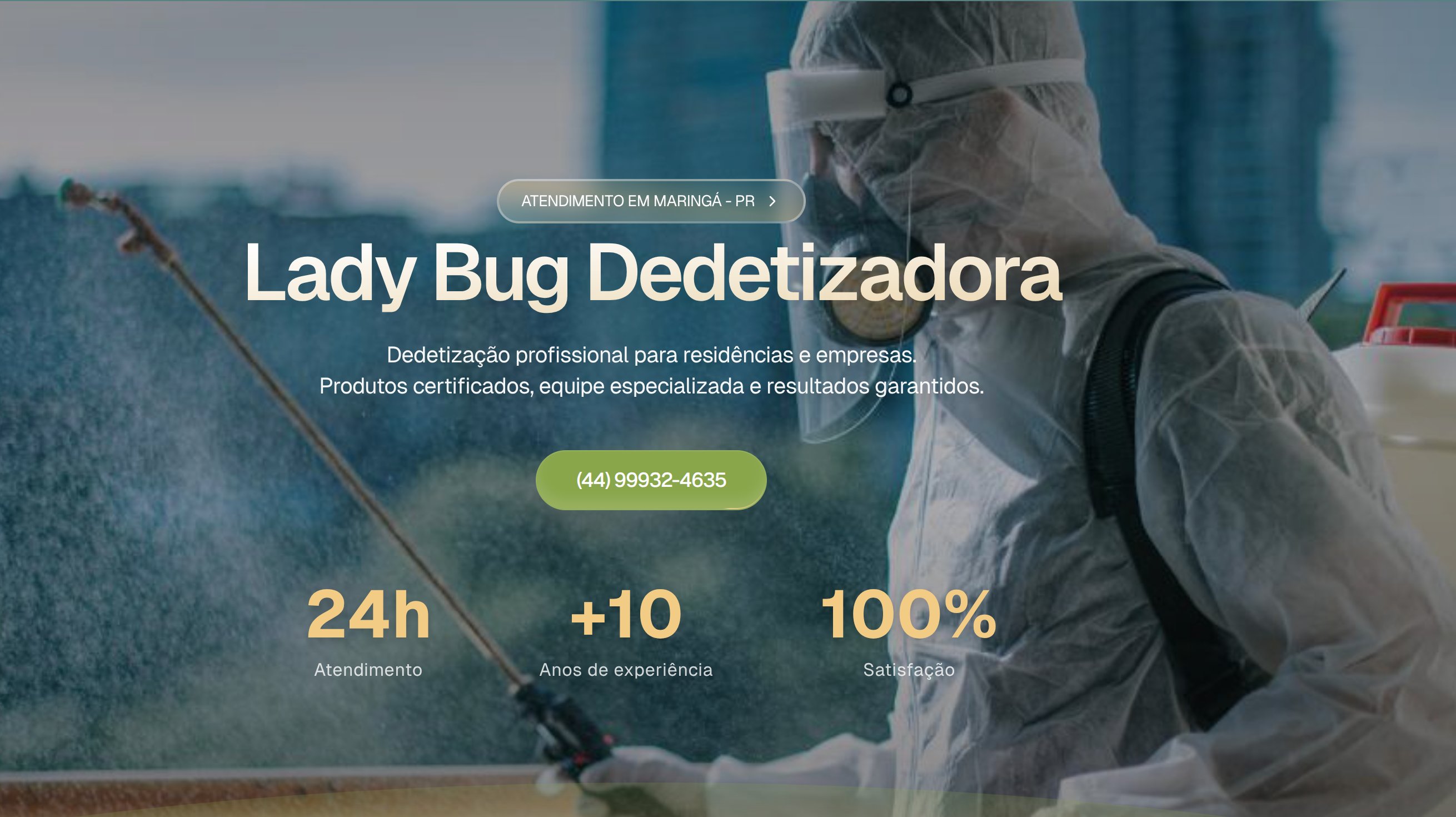 Site profissional para empresa de dedetização com foco em atendimento residencial e empresarial, destacando experiência de mais de 10 anos e atendimento 24h em Maringá-PR.