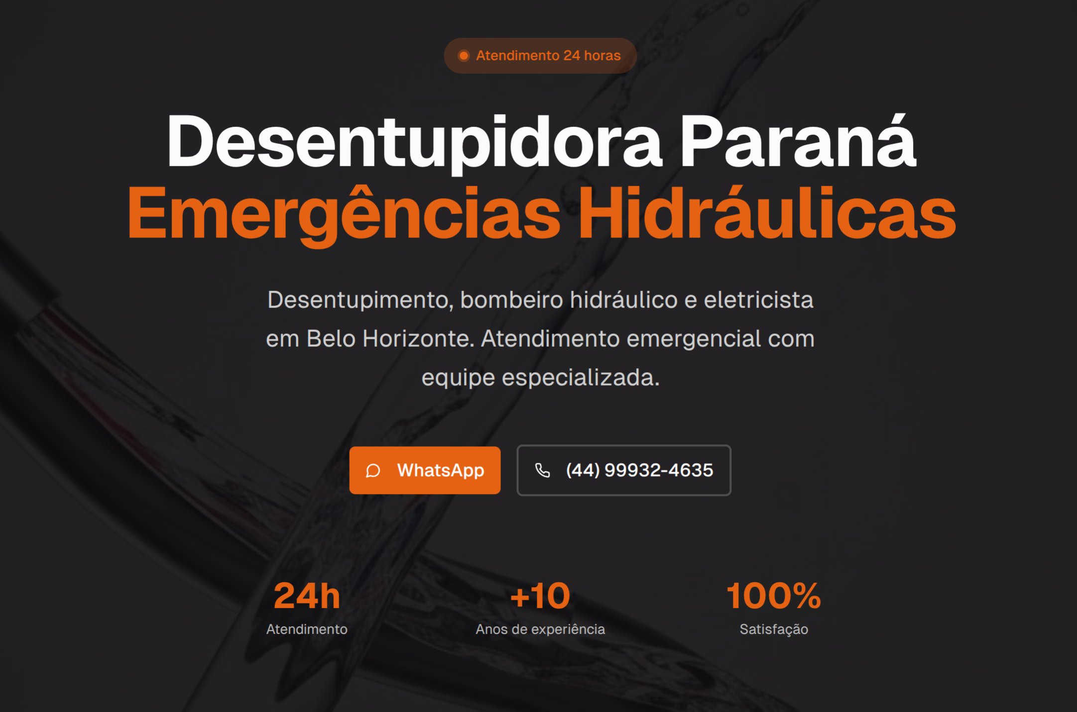 Site profissional para empresa de emergências hidráulicas com atendimento 24h, destacando desentupimento, bombeiro hidráulico e eletricista em Belo Horizonte com mais de 10 anos de experiência.